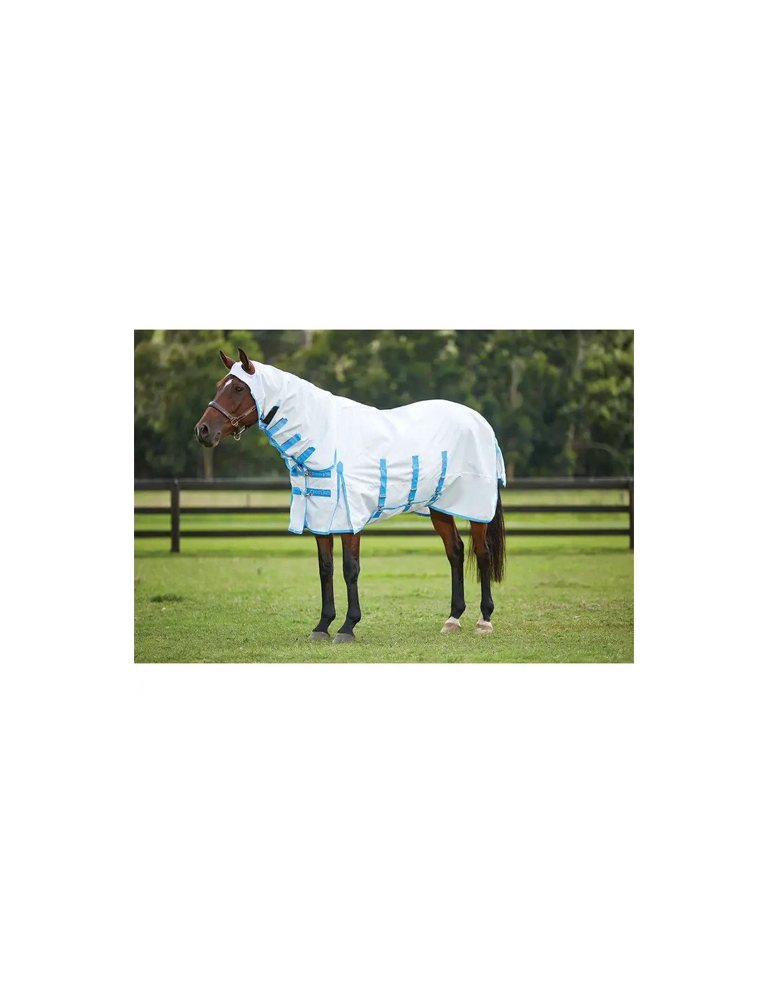 Protection de la tête à la queue pour les chevaux sensibles. Protège contre les conditions climatiques estivales, notamment les rayons UV, le blanchiment par le soleil, les parasites et les insectes, tout en réduisant les irritations et les allergies cutanées telles que la dermatite atopique.