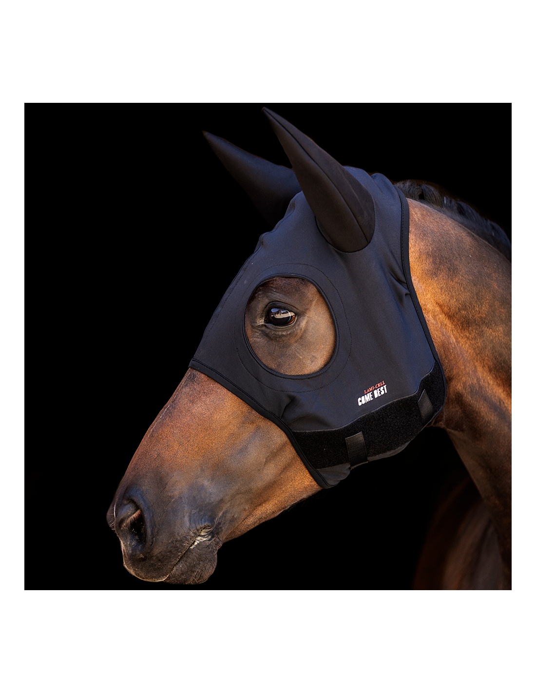 Le masque est en tissu extensible de titane et vient avec ou sans couvre-oreilles, permettant de diminuer la nervosité du cheval pendant la compétition et améliorer sa performance.