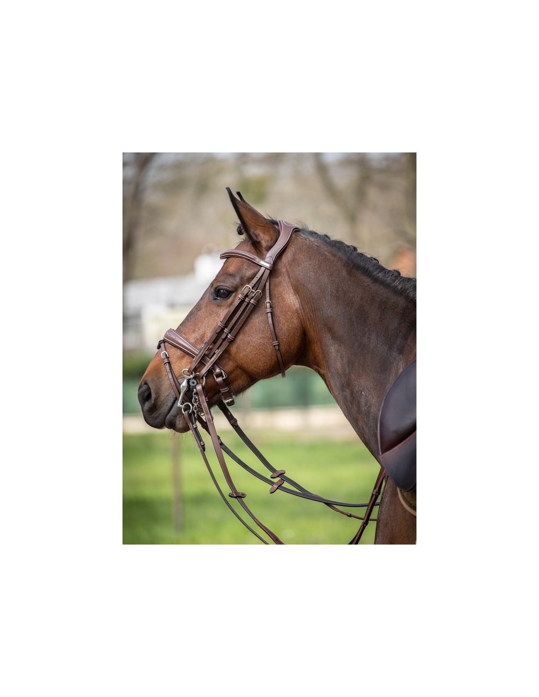 Un noseband amovible est rattaché à la muserolle. La têtière est anatomique pour apporter plus de confort au cheval et ainsi éviter les points de pression au niveau de la nuque.