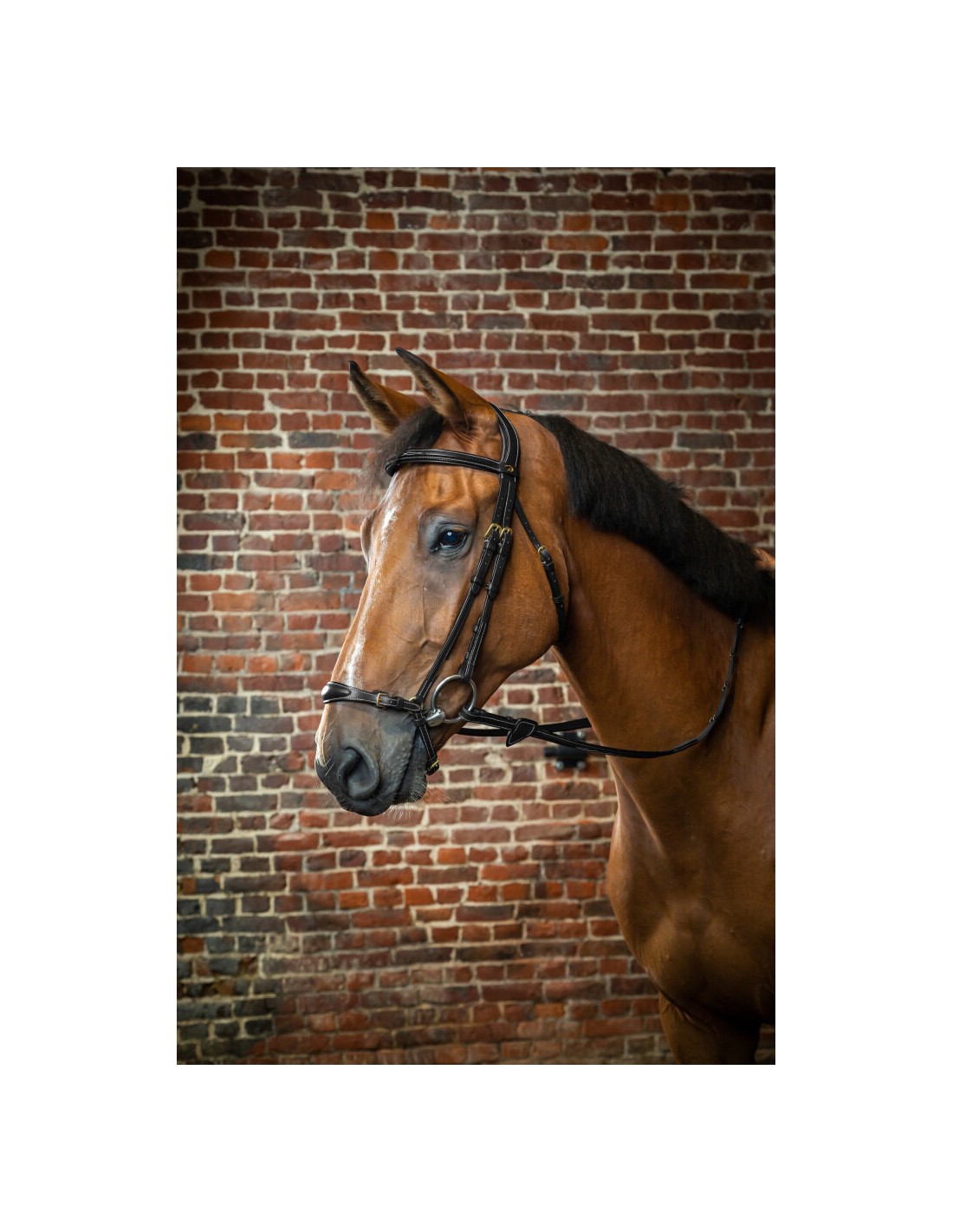 - Fermeture « pull back » en cuir souple doublé nylon, montée sur une patte de protection matelassée amovible.
