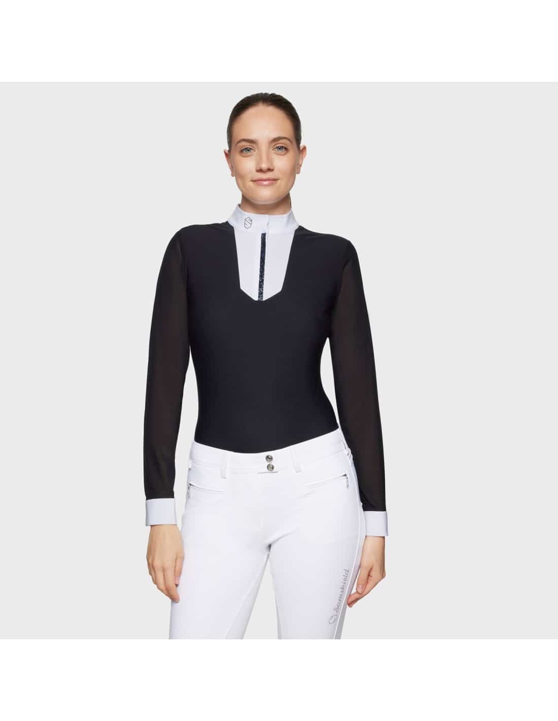 Design très élégant pour ce polo de concours à manches longues, cristaux "ultra Fine Rocks" sur le col et une petite étoile "Swarovski®" à l'arrière.