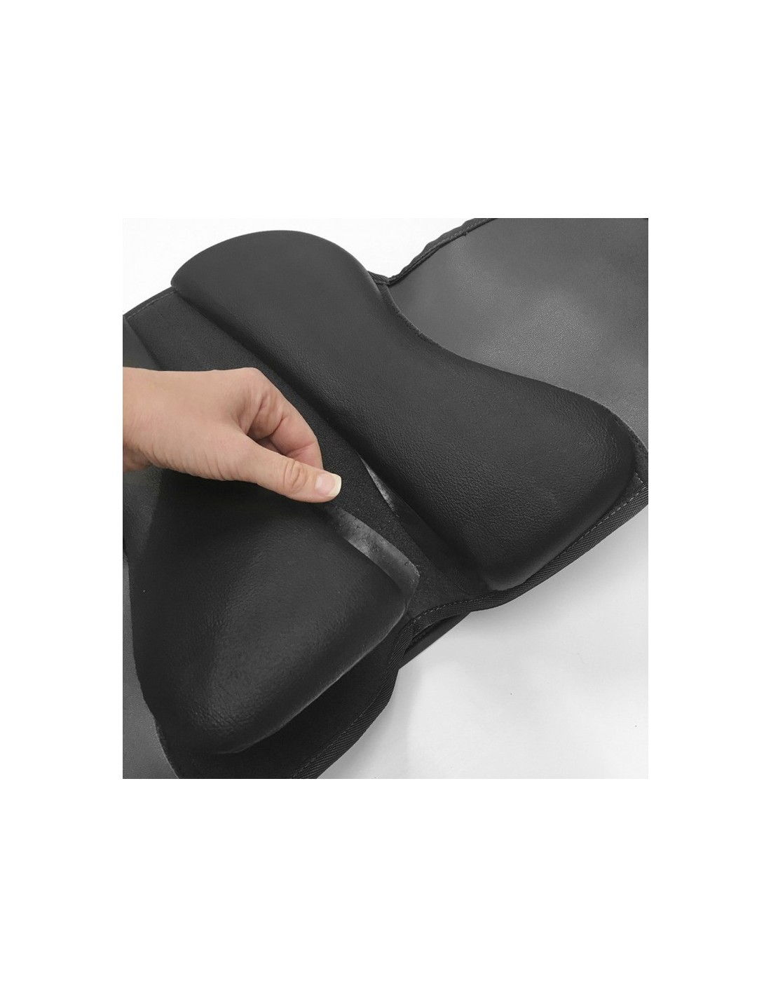 Elle est équipée de panneaux en mousse réglables et amovibles par bande auto-agrippante, d'un arçon flexible avec pommeau et troussequin surélevés en PVC.